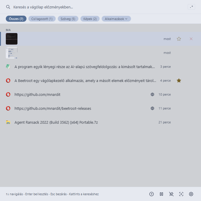 A Beetroot egy vágólapkezelő alkalmazás, amely a másolt elemek előzményeit tárolja, így azok később is visszakereshetők és újra felhasználhatók. Nem csak szöveget, hanem képeket is kezel, és gyors keresést biztosít a mentett elemek között (fuzzy és regex alapú szűréssel). A vágólap tartalma nem vész el új másoláskor, hanem tartósan megmarad, és kategóriák, jegyzetek vagy pinelés segítségével rendszerezhető.