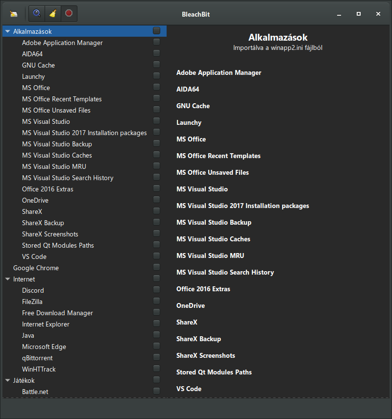 Amiben viszont a BleachBit erős, az a folyamatosan frissített közösségi alapú gyűjtés, ami által 2500-nál is több programot kezel, és emiatt tudja mellőlük a fölösleges fájlokat letörölni. Ehhez a beállításokban be kell kapcsolni a winapp2.ini
