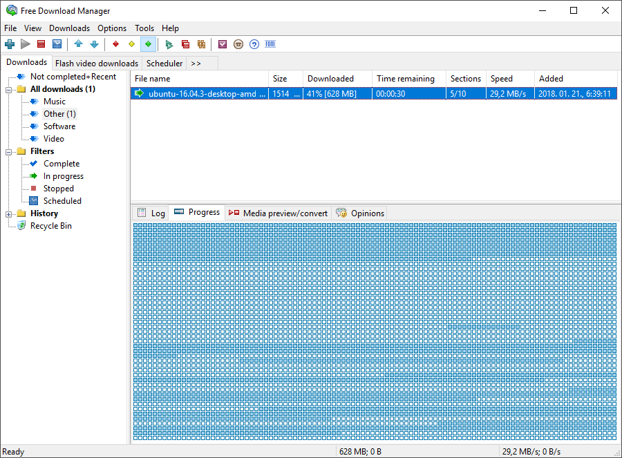 Letöltéskezelő, ami egyetlen fájlt is több szálon képes letölteni, ami előnyös lehet lassú szerverek esetén. Beállítás szerint figyeli a vágólapot, de a manuálisan megadott URL-eket is fogadja, amiből egy fájlhoz több is tartozhat, hogy kombinálja a szerverek kiszolgáló képességét.