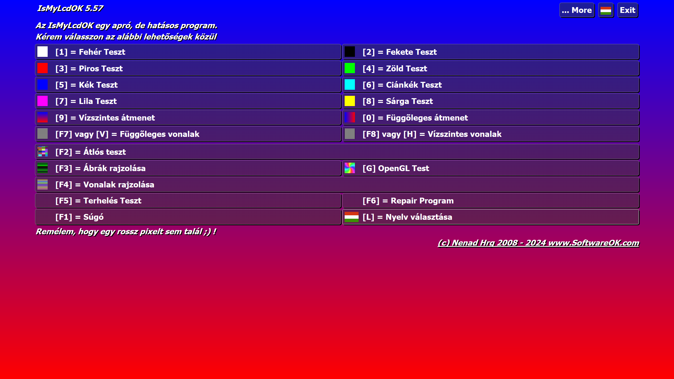 Az IsMyLcdOK egy apró segédprogram, amely különböző tesztképekkel segít a monitoron lévő hibás vagy beragadt pixelek felderítésében.