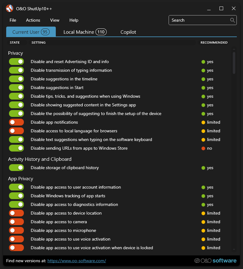 Az O&O ShutUp10++ egy Windows 10 és 11 alatt használható segédprogram, amely lehetővé teszi a telemetriai adatgyűjtés, helymeghatározás és egyéb adatvédelmi szempontból kényes funkciók letiltását. A beállítások egyszerű listába rendezve jelennek meg, így egy kattintással aktiválhatók vagy tilthatók.
