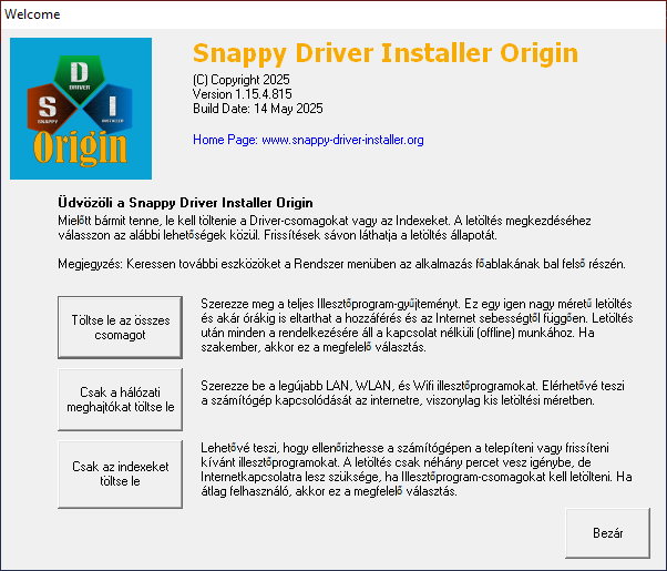 Induláskor kiválasztható, hogy csak az indexfájlok töltődjenek le (így a program listázza és frissíti a géphez illő drivereket), vagy az összes drivercsomag (~46 GB), amellyel offline módon szinte bármilyen PC frissíthető — ez különösen hasznos új gépek telepítésekor vagy internetkapcsolat hiányában.