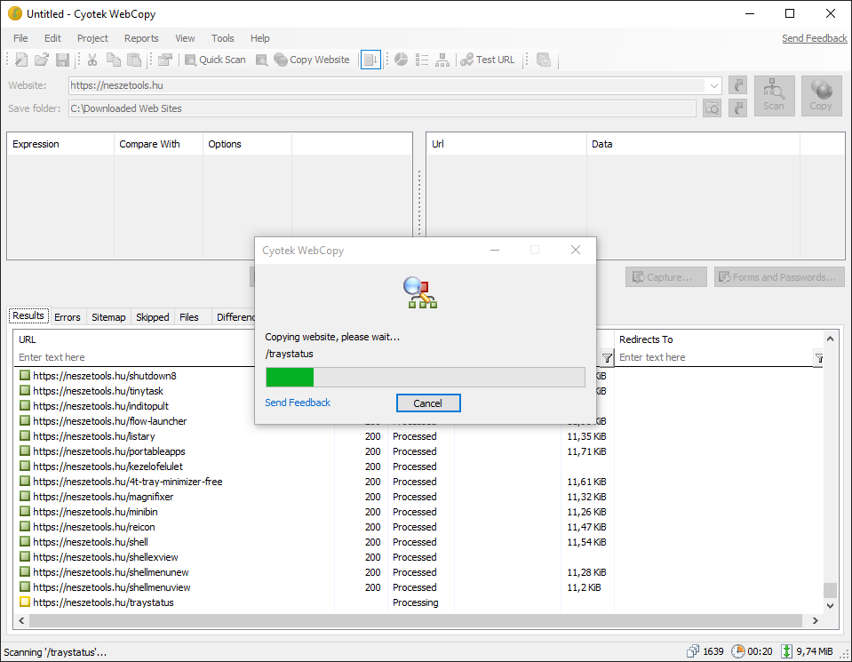 Weboldal letöltő. Pontosabb és modernebb, mint a HTTrack Website Copier. Már az előszkennelésnél beállítható, hogy hány lépésben, milyen szűrőkkel dolgozzon azért, hogy a weboldalakról minél pontosabb, ám a fölöslegektől mentes legyen a mentés.